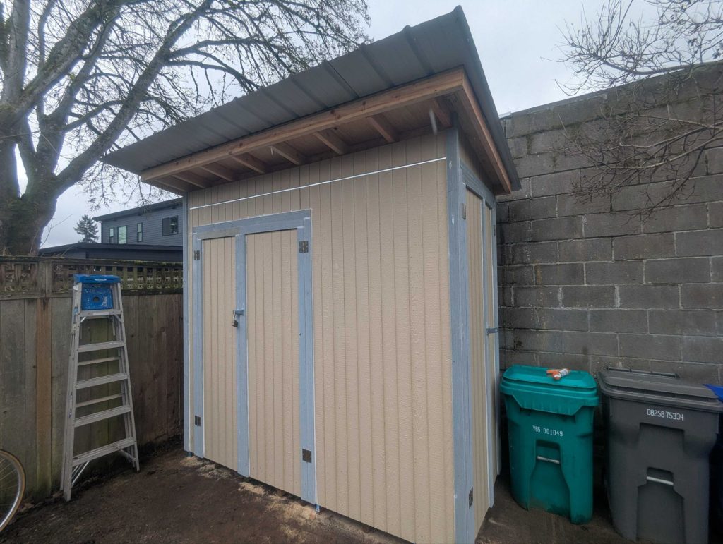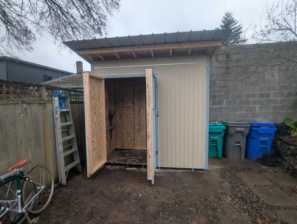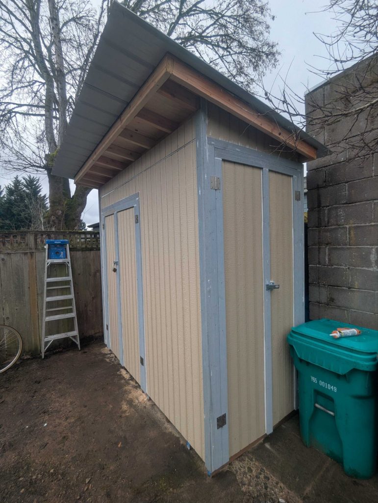 Our customer needed extra storage in a tight space. So we built a custom shed. 4 ft x 9 ft footprint, and 8.5 ft in the front for extra headroom. It also has doors that open on two sides. Pre primed siding and ready for paint. The customer will paint later when the weather dries out.